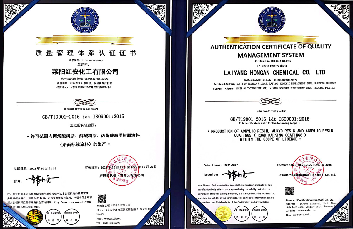 紅安化工經(jīng)過近二十年的打造和積淀,現(xiàn)已建成了一家專業(yè)研制生產涂料合成樹脂的綜合型工廠,位于山東省半島的腹地--萊陽市。公司已通過了三體系認證,即ISO9000質量管理體系認證和環(huán)境、職業(yè)健康安全管理體系認證,并獲得了六項國家發(fā)明專利,八項實用新型專利;19年榮獲山東省高新企業(yè)稱號,22年通過了復審;22年榮獲山東省瞪羚企業(yè)稱謂,還有其他一些榮譽稱號不再一一敘說。 公司現(xiàn)有樹脂合成反應釜29套,各類樹脂年生產能力約8萬噸,具有完善的檢測儀器和應用服務條件。